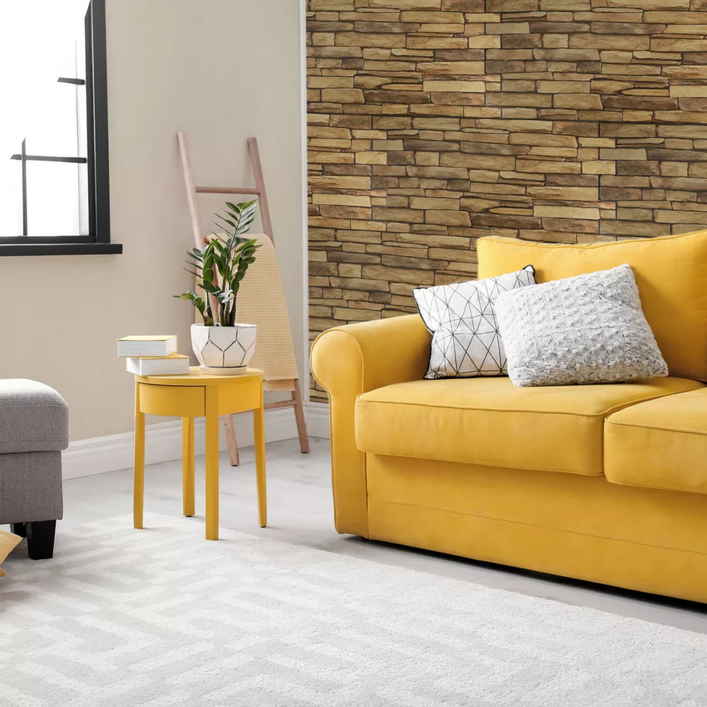 Barna palakő mintás 3D PVC falpanel nappali falán