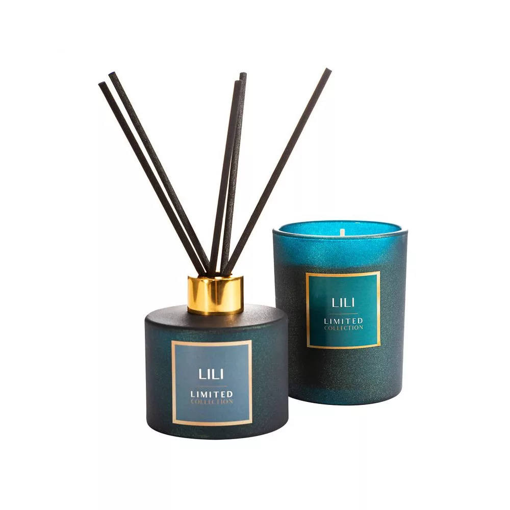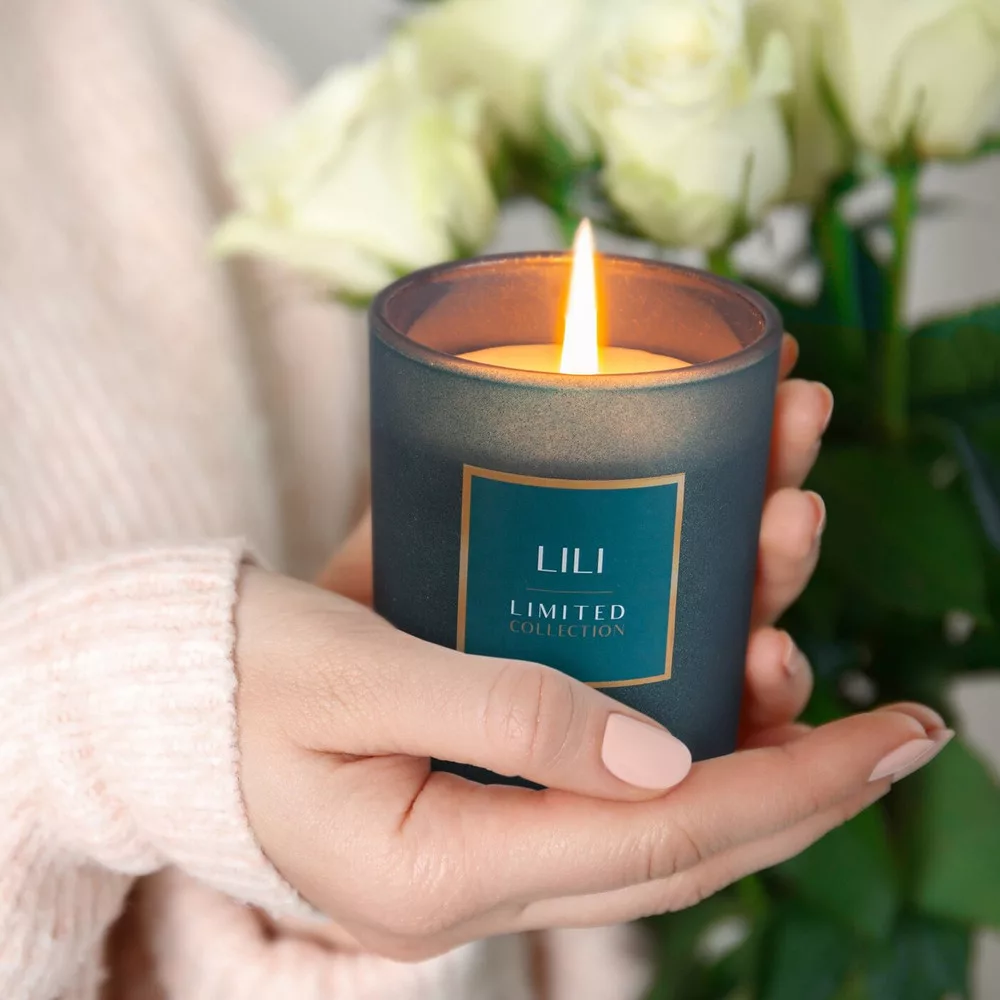Lili illatos gyertya dekorüvegben Sötét türkiz 200g