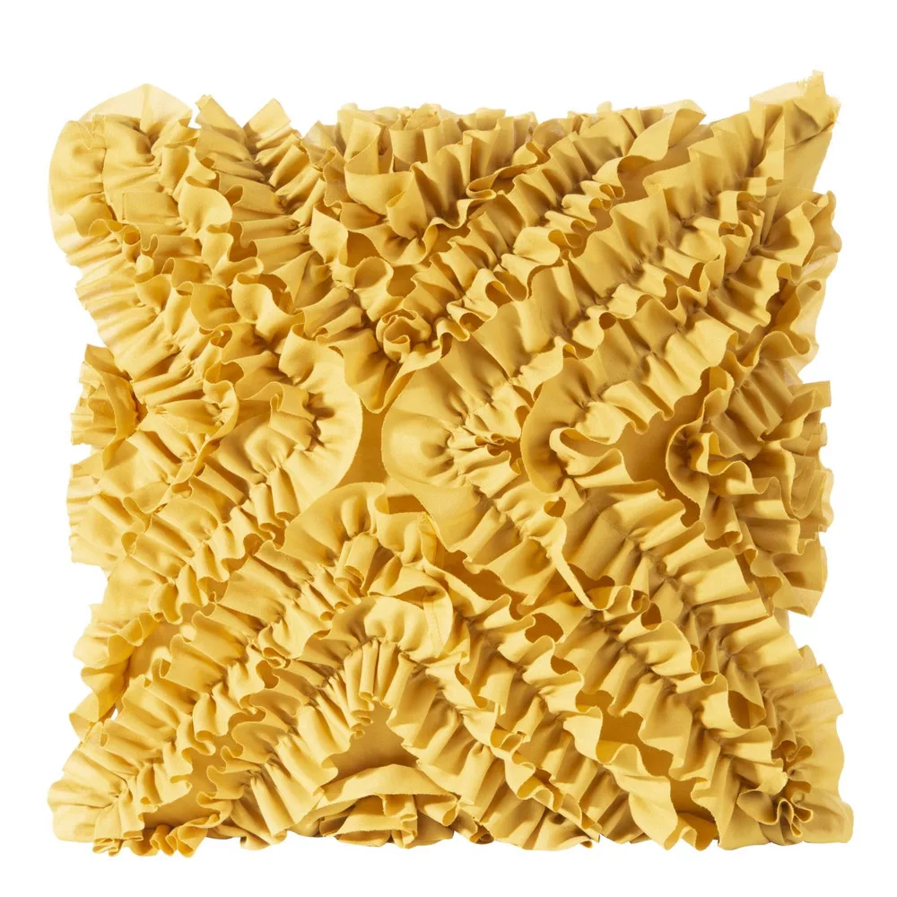 Dekoratív párna díszített kis fodor, magassága: 45 cm, szélesség: 45 cm, mustár színű. Súly: 70 GSM. Összetétel: 100% poliészter